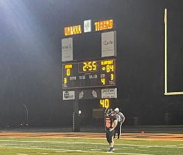 With 2:55 left on the game clock and the final score on the board, an Urbana player waits for the kickoff after Bloomington’s last scoring play. (from Facebook, photographer unknown)